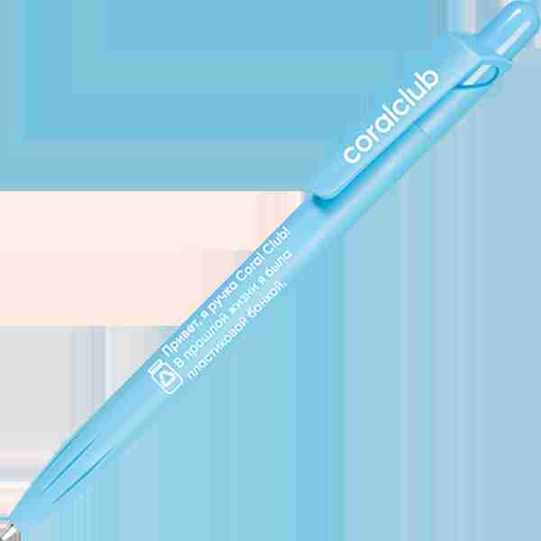 Шариковая ручка с кнопочным механизмом из материала PET-RECYCLED с надписью "Привет, я ручка Coral Club! В прошлой жизни я была пластиковой банкой".